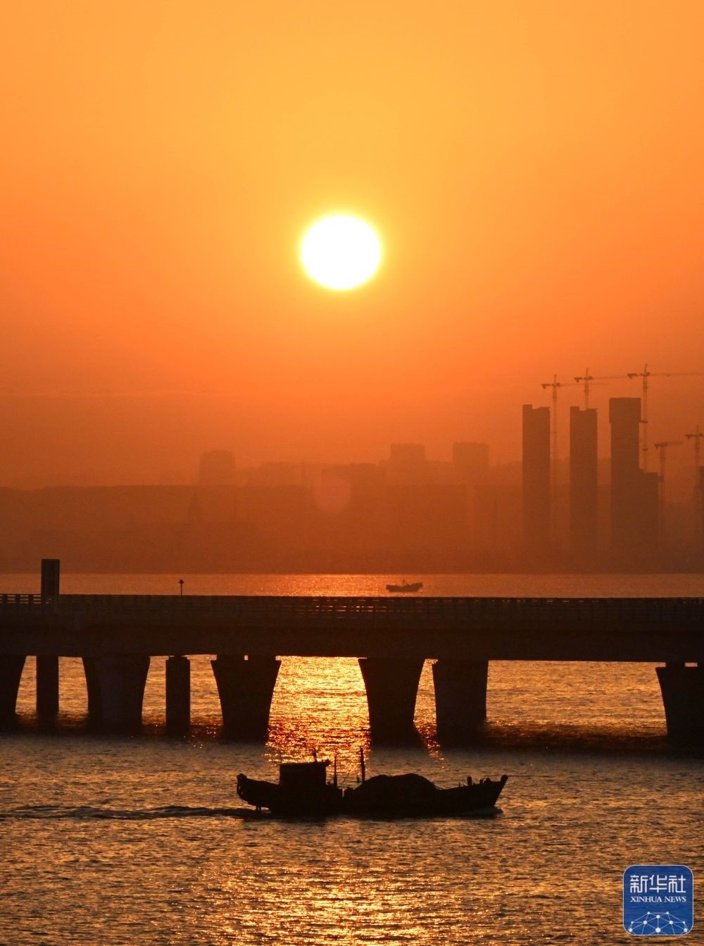 1月1日,一條漁船在新年第一縷晨光中從山東青島膠州灣跨海大橋旁駛過。新華社記者 李紫恒 攝