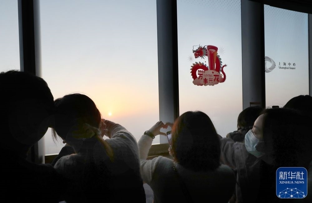 1月1日,市民游客在上海中心大廈頂樓觀光廳看日出。新華社記者 方喆 攝