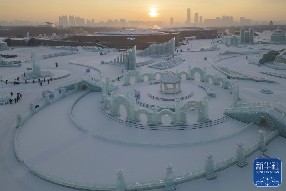 朝陽下的哈爾濱冰雪大世界園區(qū)(1月1日攝,無人機照片)。新華社記者 張濤 攝