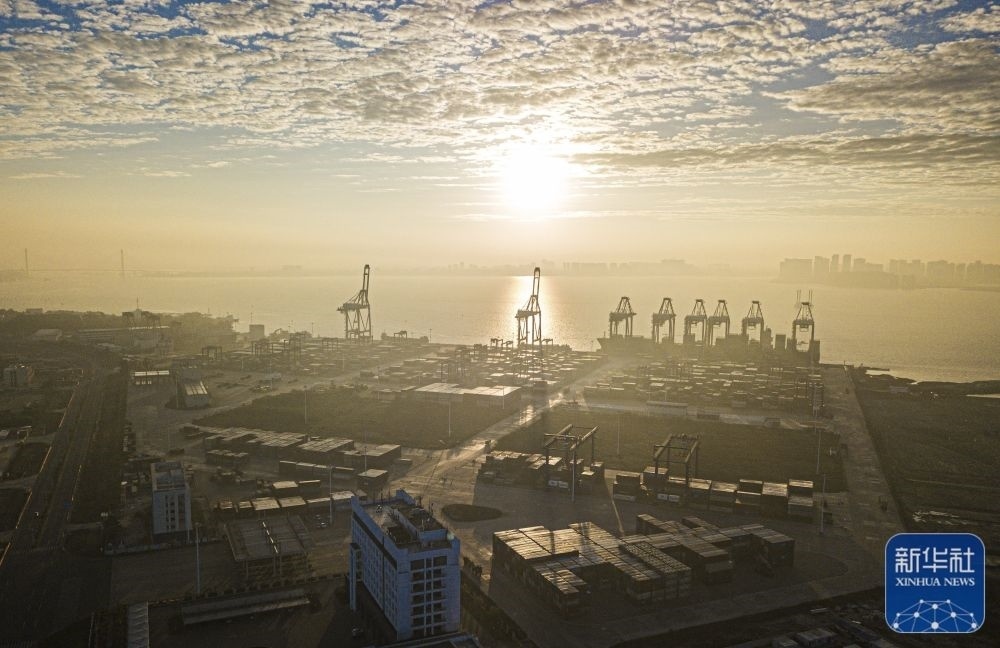 1月1日,在新年第一縷晨光里,浙江省寧波舟山港北侖港區(qū)礦石碼頭生產(chǎn)一派繁忙(無人機照片)。新華社發(fā)(蔣曉東 攝)