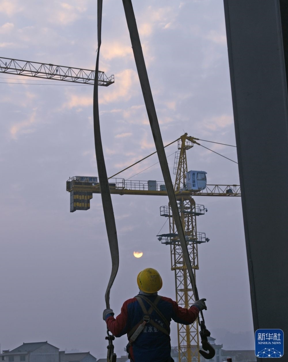1月1日,工人迎著朝陽在浙江省杭溫高鐵臺州市仙居站項目施工現(xiàn)場進行施工作業(yè)。新華社發(fā)(王華斌 攝)