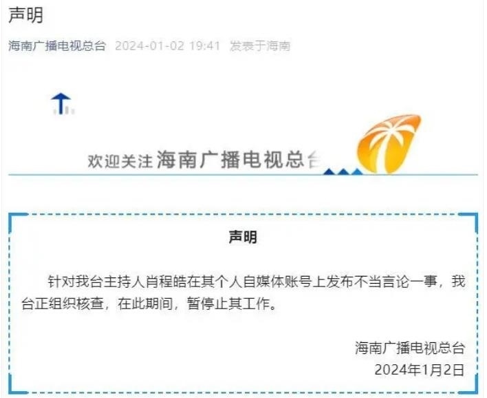 ·海南一主持人在自媒體發(fā)布不當言論,被暫停工作。
