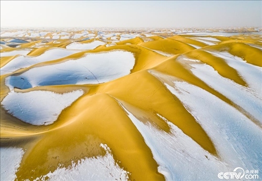 新疆巴音郭楞蒙古自治州,雪后的塔克拉瑪干沙漠,黃沙與白雪相互交融,美景如畫。