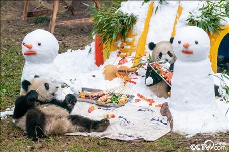 重慶動物園,大熊貓“渝可”“渝愛”在雪中擼串,享受新年美好時光。