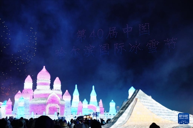 1月5日,在哈爾濱冰雪大世界園區(qū),游客在觀看哈爾濱國際冰雪節(jié)開幕式上的無人機(jī)表演。當(dāng)日,第40屆中國·哈爾濱國際冰雪節(jié)開幕,吸引眾多游客。新華社記者 王建威 攝