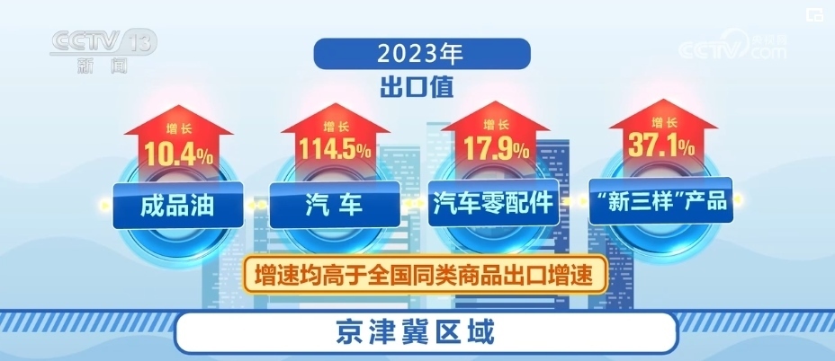 出口方面,2023年京津冀區(qū)域出口1.31萬(wàn)億元,增長(zhǎng)2.5%,占全國(guó)出口總值的5.5%。其中,成品油、汽車、汽車零配件、“新三樣”產(chǎn)品出口值分別增長(zhǎng)10.4%、114.5%、17.9%、37.1%,增速均高于全國(guó)同類商品出口增速。成品油出口量、出口值占全國(guó)成品油出口總量、出口總值的一半以上。