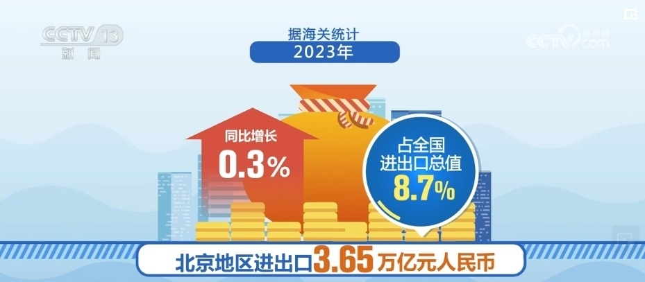 據(jù)海關(guān)統(tǒng)計(jì),2023年,北京地區(qū)進(jìn)出口3.65萬(wàn)億元人民幣,同比增長(zhǎng)0.3%,占全國(guó)進(jìn)出口總值的8.7%。