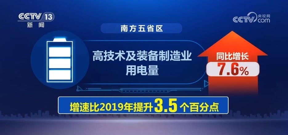 而在南方電網(wǎng)經(jīng)營區(qū)域內(nèi)的廣東、廣西等五省區(qū),高技術(shù)及裝備制造業(yè)用電量同比增長7.6%,增速比2019年提升3.5個百分點(diǎn),反映工業(yè)經(jīng)濟(jì)轉(zhuǎn)型升級態(tài)勢加快。