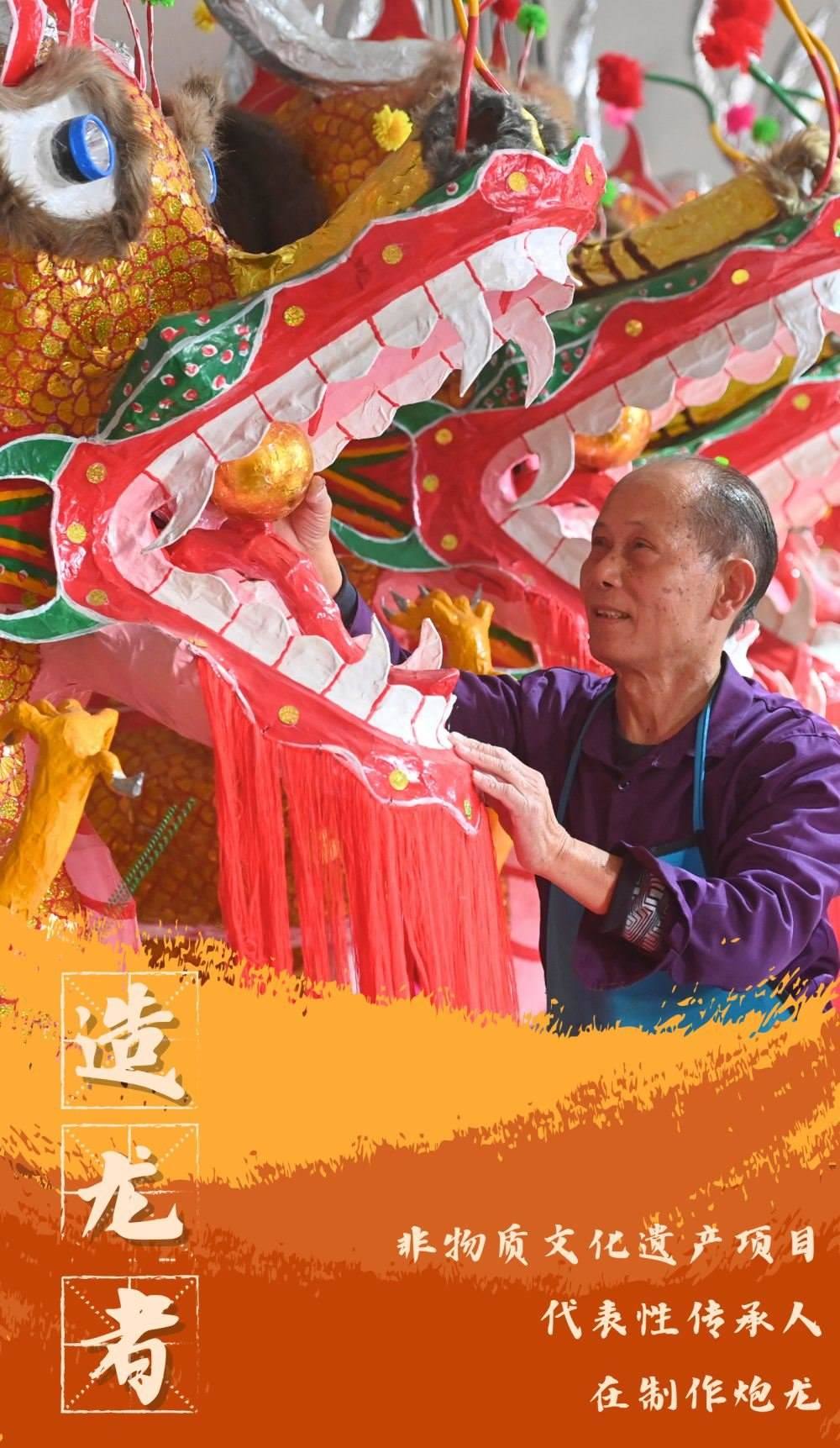 用竹篾扎制龍頭、龍尾,用砂紙裝裱,麻繩串聯(lián)龍身,用龍布裝飾,僅龍頭就有1000多個捆綁點(diǎn),一條炮龍需多人合制半個月才能完成……造龍,需要非凡的耐心和超群的手藝。