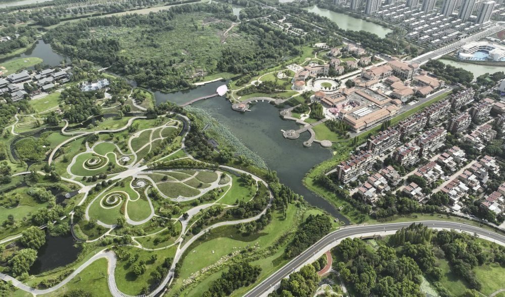 位于浙江省湖州市八里店鎮(zhèn)的西山漾國家城市濕地公園和周邊的居民區(qū)相互融合(無人機(jī)照片,2023年8月23日攝)。新華社記者 翁忻旸 攝