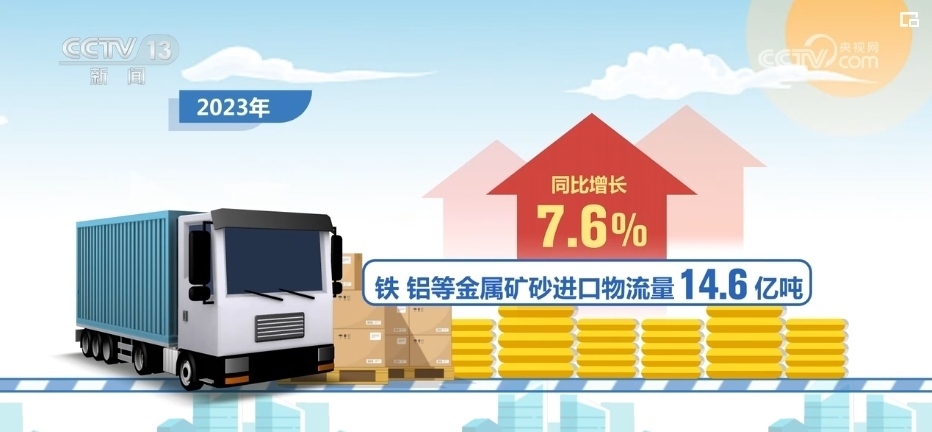 2023年,進口物流總額18.0萬億元,同比增長13.0%,進口物流量保持快速恢復(fù)態(tài)勢。原油、天然氣、煤炭等能源產(chǎn)品進口物流量11.6億噸,同比增長27.2%,鐵、鋁等金屬礦砂進口物流量14.6億噸,同比增長7.6%。