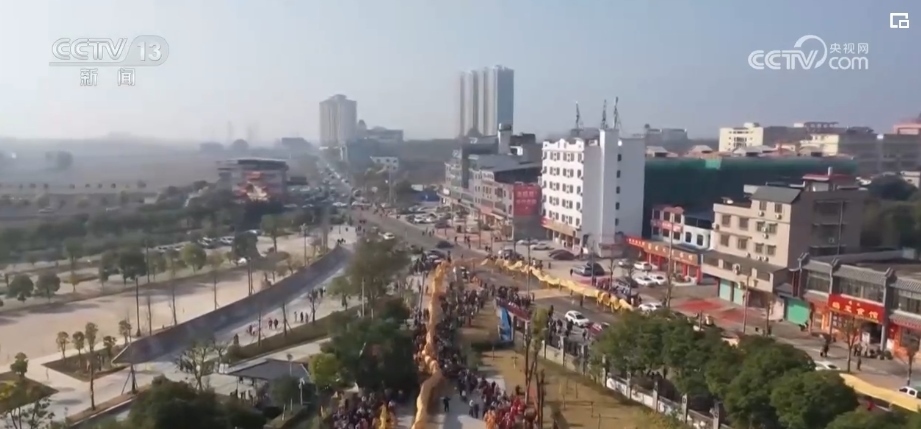 2月10日上午,在廣東韶關(guān)南雄市珠璣古巷,一場盛大的九十九節(jié)龍巡游熱鬧上演。九十九節(jié)龍的龍頭由五種顏色繪制,兩額長著長角、兩邊附有魚鱗片,金光閃閃、色彩鮮艷,龍首龍尾還粘有九十九朵長壽之花。它在珠璣古巷內(nèi)巡游,為父老鄉(xiāng)親祈福,并分別在珠璣牌坊、百姓堂列隊(duì),用龍身擺出“龍年大吉”“天下太平”的新年祝福。