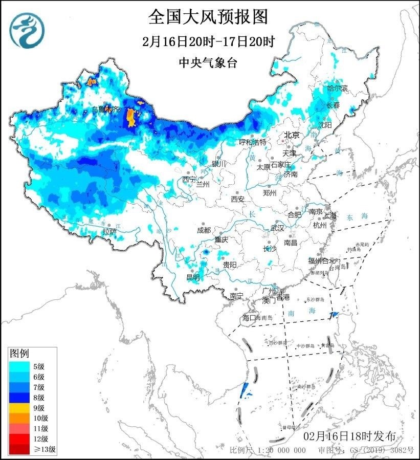 2月17日20時至18日20時,新疆北疆東部和南疆盆地、內(nèi)蒙古西部、青海西南部、西藏西部、甘肅西部等地將有5~7級、陣風8~9級的大風,新疆山口地區(qū)風力可達10級,陣風12~13級;黃海大部海域、東海北部海域?qū)⒂?級、陣風8~9級的大風。