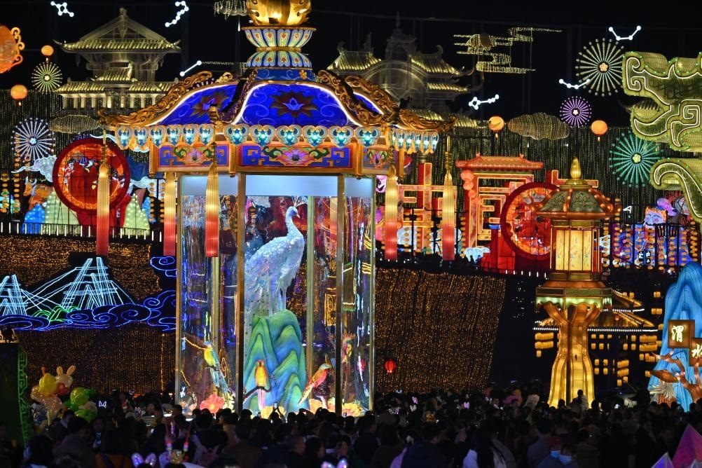 在四川自貢,3萬多名游客走進“中國燈城”自貢中華彩燈大世界,觀彩燈、賞演藝、拍全家福??罩?,600架無人機排列出湯圓、舞龍燈等圖樣;地面,舞龍舞獅等民俗表演輪番上演,上百名身著漢服的演員手提花燈巡游……