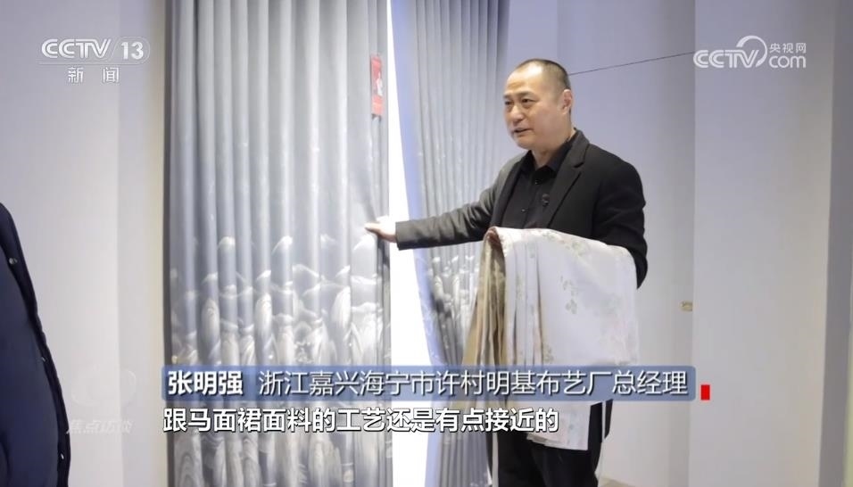 浙江嘉興海寧市許村明基布藝廠總經(jīng)理張明強(qiáng):“提花其實(shí)比較接近,跟馬面裙面料的工藝有點(diǎn)接近,但是馬面裙的密度會超過它很多。”