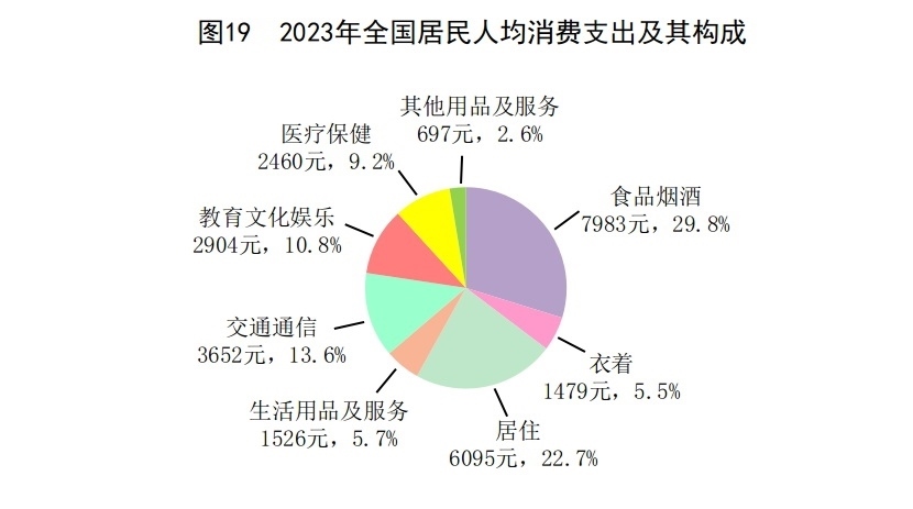 全年全國居民人均消費支出26796元,比上年增長9.2%,扣除價格因素,實際增長9.0%。其中,人均服務性消費支出[59]12114元,比上年增長14.4%,占居民人均消費支出比重為45.2%。按常住地分,城鎮(zhèn)居民人均消費支出32994元,增長8.6%,扣除價格因素,實際增長8.3%;農(nóng)村居民人均消費支出18175元,增長9.3%,扣除價格因素,實際增長9.2%。全國居民恩格爾系數(shù)為29.8%,其中城鎮(zhèn)為28.8%,農(nóng)村為32.4%。