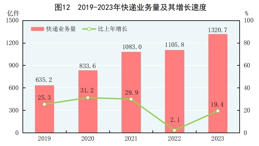 全年完成郵政行業(yè)寄遞業(yè)務總量[29]1625億件,比上年增長16.8%。郵政業(yè)完成郵政函件業(yè)務9.7億件,包裹業(yè)務0.2億件,快遞業(yè)務量1320.7億件,快遞業(yè)務收入12074億元。全年完成電信業(yè)務總量[30]18327億元,比上年增長16.8%。年末移動電話基站數(shù)[31]1162萬個,其中4G基站629萬個,5G基站338萬個。全國電話用戶總數(shù)189992萬戶,其中移動電話用戶172660萬戶。移動電話普及率為122.5部/百人。固定互聯(lián)網(wǎng)寬帶接入用戶[32]63631萬戶,比上年末增加4666萬戶,其中100M速率及以上的寬帶接入用戶[33]60136萬戶,增加4756萬戶。蜂窩物聯(lián)網(wǎng)終端用戶[34]23.32億戶,增加4.88億戶。互聯(lián)網(wǎng)上網(wǎng)人數(shù)10.92億人,其中手機上網(wǎng)人數(shù)10.91億人?;ヂ?lián)網(wǎng)普及率為77.5%,其中農(nóng)村地區(qū)互聯(lián)網(wǎng)普及率為66.5%。全年移動互聯(lián)網(wǎng)用戶接入流量3015億GB,比上年增長15.2%。軟件和信息技術(shù)服務業(yè)[35]完成軟件業(yè)務收入123258億元,比上年增長13.4%。
