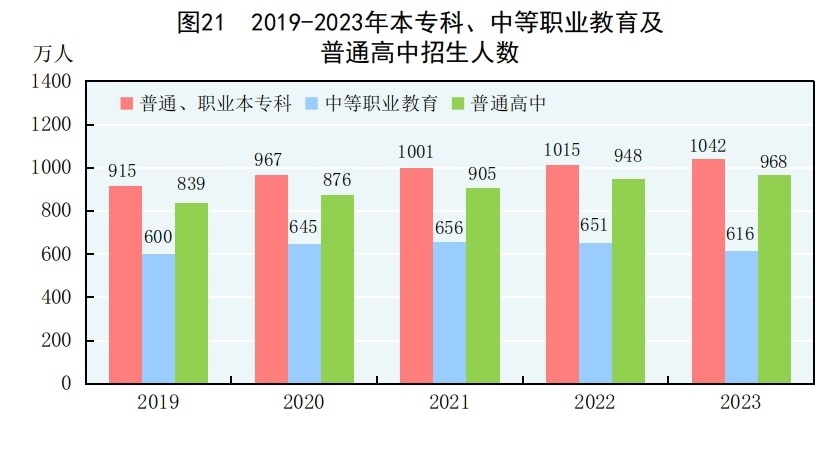 全年研究生教育招生130.2萬人,在學研究生388.3萬人,畢業(yè)生101.5萬人。普通、職業(yè)本專科[70]招生1042.2萬人,在校生3775.0萬人,畢業(yè)生1047.0萬人。中等職業(yè)教育[71]招生616.5萬人,在校生1737.9萬人,畢業(yè)生537.1萬人。普通高中招生967.8萬人,在校生2803.6萬人,畢業(yè)生860.4萬人。初中招生1754.6萬人,在校生5243.7萬人,畢業(yè)生1623.6萬人。普通小學招生1877.9萬人,在校生10836.0萬人,畢業(yè)生1763.5萬人。特殊教育招生15.5萬人,在校生91.2萬人,畢業(yè)生17.3萬人。學前教育在園幼兒4093.0萬人。九年義務教育鞏固率為95.7%,高中階段毛入學率為91.8%。