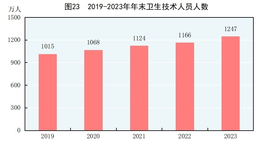 年末全國共有醫(yī)療衛(wèi)生機構(gòu)107.1萬個,其中醫(yī)院3.9萬個,在醫(yī)院中有公立醫(yī)院1.2萬個,民營醫(yī)院2.7萬個;基層醫(yī)療衛(wèi)生機構(gòu)101.6萬個,其中鄉(xiāng)鎮(zhèn)衛(wèi)生院3.4萬個,社區(qū)衛(wèi)生服務中心(站)3.7萬個,門診部(所)36.2萬個,村衛(wèi)生室58.3萬個;專業(yè)公共衛(wèi)生機構(gòu)1.2萬個,其中疾病預防控制中心3426個,衛(wèi)生監(jiān)督所(中心)2791個。衛(wèi)生技術(shù)人員1247萬人,其中執(zhí)業(yè)醫(yī)師和執(zhí)業(yè)助理醫(yī)師478萬人,注冊護士563萬人。醫(yī)療衛(wèi)生機構(gòu)床位1020萬張,其中醫(yī)院800萬張,鄉(xiāng)鎮(zhèn)衛(wèi)生院151萬張。全年總診療人次[75]95.6億人次,出院人次[76]3.0億人次。