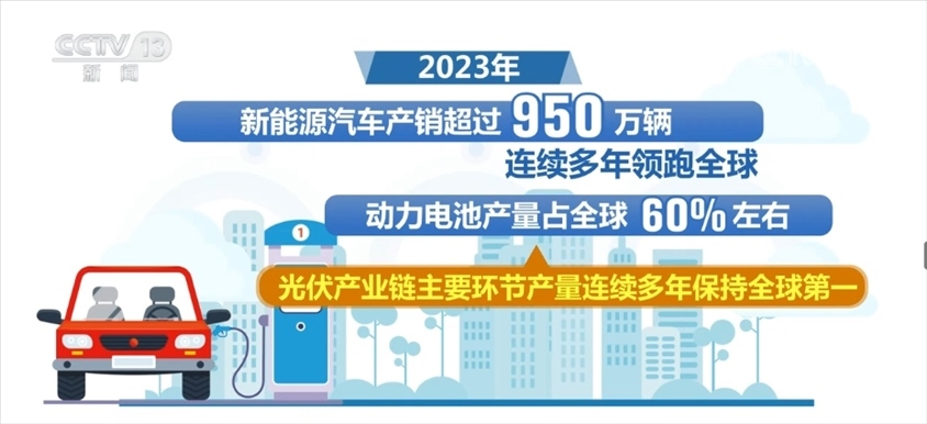 2023年,我國高技術(shù)制造業(yè)、裝備制造業(yè)增加值占規(guī)模以上工業(yè)增加值比重分別達(dá)到15.7%和33.6%。新能源汽車產(chǎn)銷超過950萬輛,連續(xù)多年領(lǐng)跑全球,動力電池產(chǎn)量占全球60%左右,光伏產(chǎn)業(yè)鏈主要環(huán)節(jié)產(chǎn)量連續(xù)多年保持全球第一。