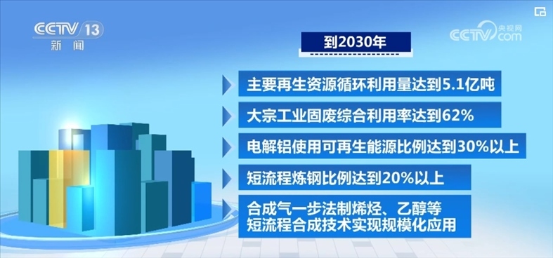 《指導(dǎo)意見》提出,到2030年,主要再生資源循環(huán)利用量達(dá)到5.1億噸,大宗工業(yè)固廢綜合利用率達(dá)到62%,電解鋁使用可再生能源比例達(dá)到30%以上,短流程煉鋼比例達(dá)到20%以上,合成氣一步法制烯烴、乙醇等短流程合成技術(shù)實現(xiàn)規(guī)?;瘧?yīng)用。