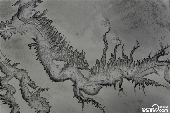 浙江嘉興海寧黃灣鎮(zhèn),錢塘江退潮后出現(xiàn)騰飛的“潮汐巨龍”。