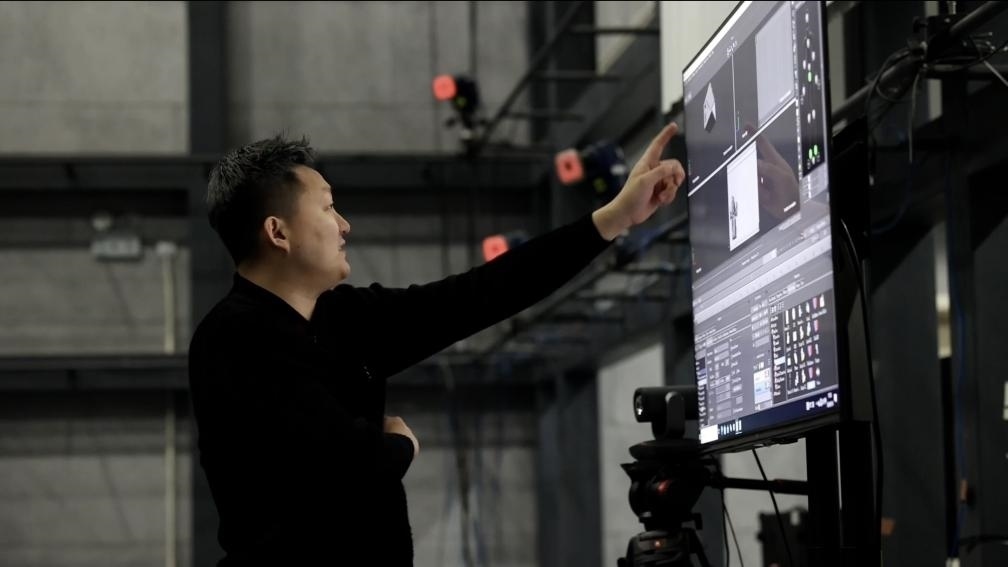“這是動作數(shù)字孿生,利用光學(xué)動捕技術(shù),棚內(nèi)多個專業(yè)攝像頭捕捉演員身上的特定標記,以毫秒級的速率計算出角色的運動軌跡,然后將數(shù)據(jù)傳送到電腦上,實現(xiàn)虛擬人物的動作?!眹覄勇@公共技術(shù)服務(wù)平臺動捕棚的技術(shù)顧問崔盛輯向記者介紹道。
