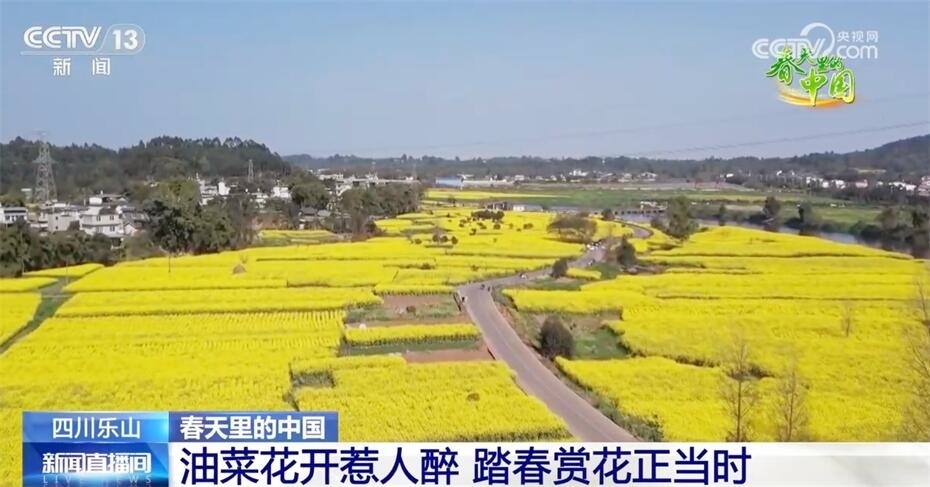 遠(yuǎn)眺峨眉山,近看峨眉河,萬(wàn)頃金波花如海,流金溢彩百里香。現(xiàn)在我們看到的是四川樂(lè)山市中區(qū) 永和村的近千畝油菜花,在陽(yáng)光照射下,猶如斑斕的綢帶,妝點(diǎn)了峨眉河沿岸五彩的山色春光。趁著晴好天氣,市民、游客來(lái)到戶外踏青賞景,在花田中徜徉流連,感受春日美好時(shí)光。