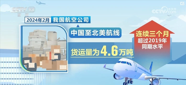 受跨境電商等多因素帶動,2024年以來,我國至海外主要貨運市場均表現(xiàn)良好。2月,我國航空公司在中國至歐洲航線完成貨運規(guī)模最大,達9.2萬噸,占比達42.3%;至北美航線貨運量為4.6萬噸,連續(xù)3個月超過2019年同期水平;與共建“一帶一路”國家之間完成貨郵運輸量6.6萬噸,占比超過三成,較2019年同期增長143.8%。