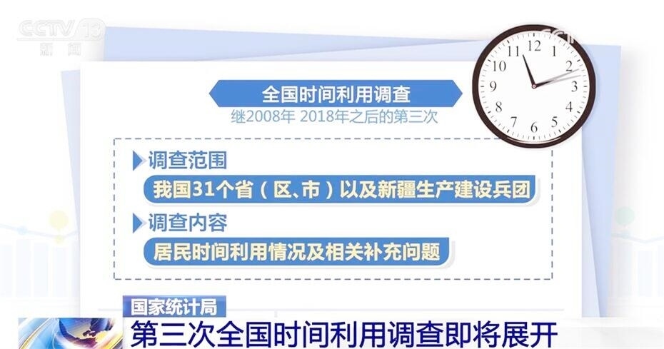 此次全國時間利用調查是繼2008年、2018年之后的第三次,調查范圍包括我國31個?。▍^(qū)、市)以及新疆生產建設兵團,調查的內容為居民時間利用情況及相關補充問題。