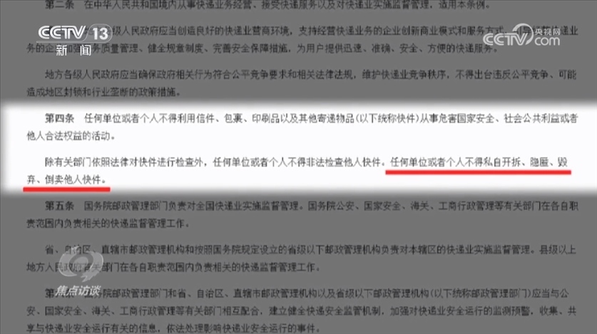 國務(wù)院頒布的《快遞暫行條例》第四條明確規(guī)定:“任何單位或者個人不得私自開拆、隱匿、毀棄、倒賣他人快件?!?/p>