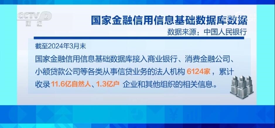 截至2024年3月末,國家金融信用信息基礎(chǔ)數(shù)據(jù)庫接入商業(yè)銀行、消費金融公司、小額貸款公司等各類從事信貸業(yè)務的法人機構(gòu)6124家,累計收錄11.6億自然人、1.3億戶企業(yè)和其他組織的相關(guān)信息。