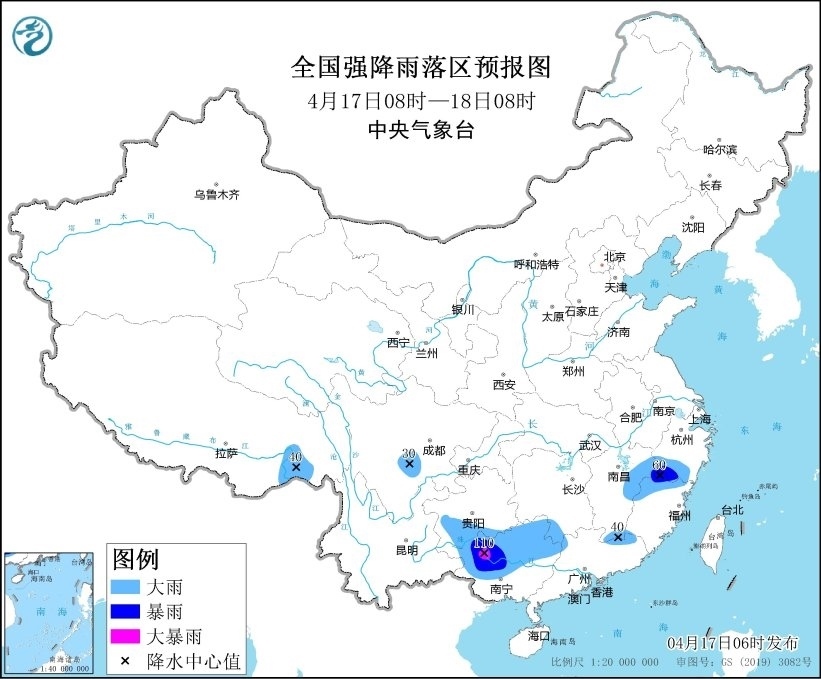 預(yù)計(jì),4月17日08時(shí)至18日08時(shí),江西中北部、浙江南部、福建西北部、四川盆地西南部、貴州東南部、廣西中北部、廣東北部等地部分地區(qū)有大到暴雨,其中,廣西西部等地局地有大暴雨(100~110毫米)。上述部分地區(qū)伴有短時(shí)強(qiáng)降水(最大小時(shí)降雨量30~60毫米,局地可超過(guò)70毫米),局地有雷暴大風(fēng)等強(qiáng)對(duì)流天氣。