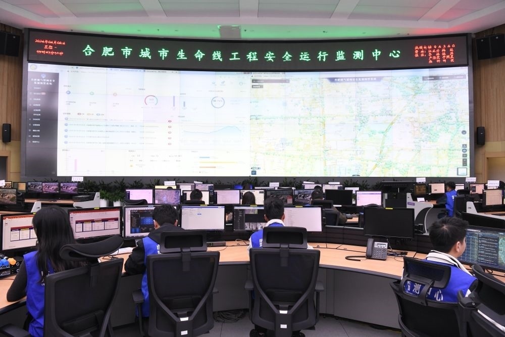 技術(shù)人員在位于清華大學(xué)合肥公共安全研究院的合肥市城市生命線工程安全運(yùn)行監(jiān)測中心值守(2024年4月8日攝)。合肥市2015年啟動城市生命線安全工程建設(shè),逐步構(gòu)建燃?xì)狻蛄?、供水、排水、熱力、綜合管廊、消防、水環(huán)境八大領(lǐng)域立體化監(jiān)測網(wǎng),探索出一條以場景應(yīng)用為依托、以智慧防控為導(dǎo)向、以創(chuàng)新驅(qū)動為內(nèi)核、以市場運(yùn)作為抓手的城市安全發(fā)展新模式。