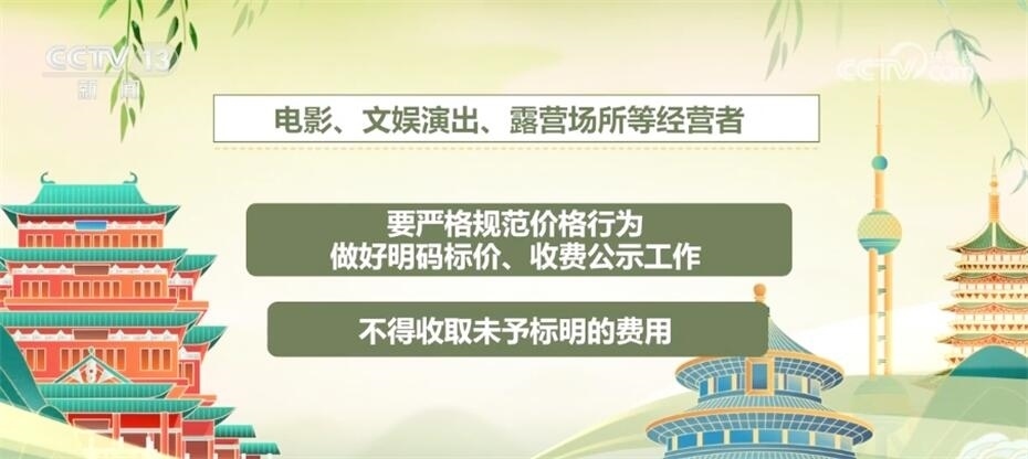電影、文娛演出、露營場所等經(jīng)營者要嚴格規(guī)范價格行為,做好明碼標(biāo)價、收費公示工作,不得收取未予標(biāo)明的費用。