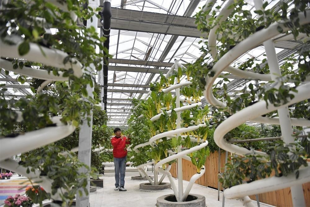 2023年5月13日,在河北曲周縣育苗產業(yè)園,苗樂園科技小院的學生在查看無土栽培蔬菜。