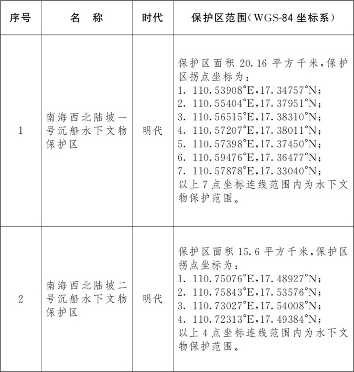 ·國務(wù)院核定公布南海西北陸坡一號、二號沉船水下文物保護(hù)區(qū)名單。