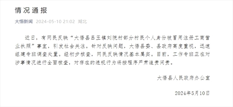 ·湖北大悟百余村民反映身份被冒用注冊個(gè)體工商戶,湖北大悟縣通報(bào)。