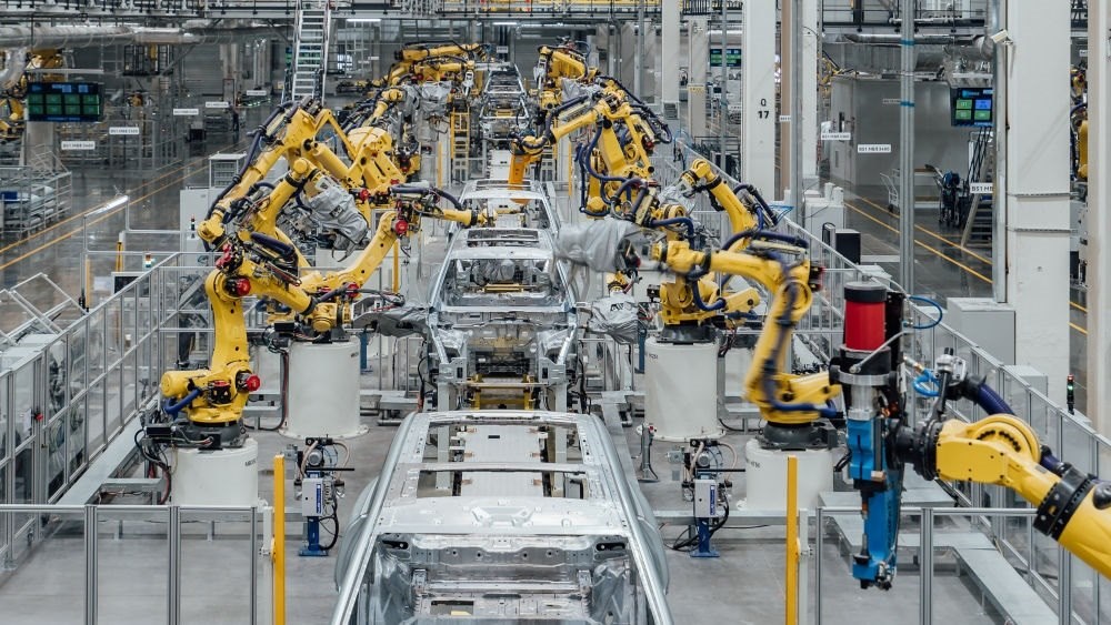 這是在重慶市兩江新區(qū)拍攝的賽力斯汽車超級(jí)工廠焊裝車間生產(chǎn)線(2024年2月26日攝,無人機(jī)照片) 新華社發(fā)(高彰 攝)。