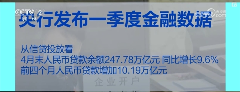 從信貸投放看,4月末,人民幣貸款余額247.78萬億元,同比增長9.6%。前4個月,人民幣貸款增加10.19萬億元。