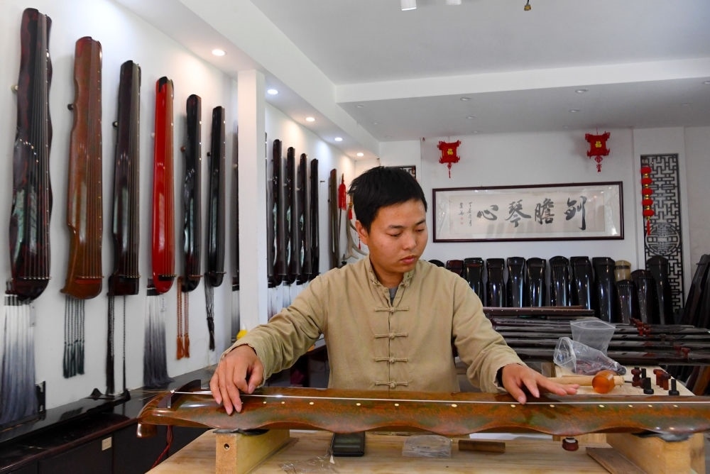 在堌陽(yáng)鎮(zhèn)徐場(chǎng)村,沿街宅院里傳出打磨木材和動(dòng)聽(tīng)的琴瑟之聲。尋聲踏入小院,“90后”琴師徐亞沖正撥動(dòng)琴弦,調(diào)試古琴?!爸魄俨粌H是我們致富的門(mén)路,彈琴已成為我們的新生活方式?!?/p>