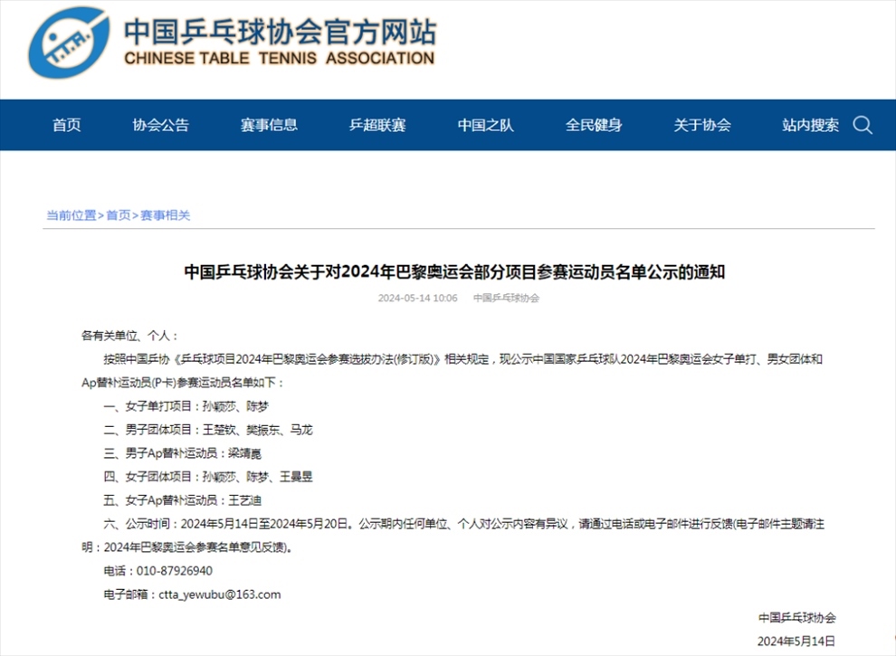 ·中國乒協(xié)公示巴黎奧運(yùn)會(huì)女單、男女團(tuán)參賽運(yùn)動(dòng)員名單。