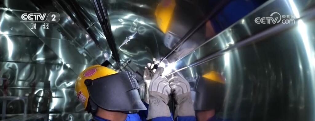 上海市長興島造船基地,記者身后的巨輪是我國新一代天然氣運(yùn)輸船“綠能瀛”,它總長299米,寬度是46.4米,這一艘船的用鋼量就達(dá)到了25000噸,其甲板面積相當(dāng)于3個標(biāo)準(zhǔn)足球場,可裝載17.4萬立方米液化天然氣,能夠滿足700萬個家庭一個月的用氣需求。