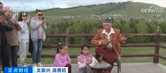 這位哈薩克族老人正在表演的木偶山羊舞是阿勒泰地區(qū)級非物質文化遺產,木偶山羊身上的線繩與老人的手指相連,隨著音樂的節(jié)奏,山羊翩翩起舞。這樣的表演吸引了不少游客前來欣賞。