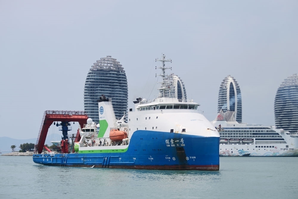 “探索一號”科考船搭載“奮斗者”號全海深載人潛水器返回海南三亞(2024年3月28日攝)。此次科考?xì)v時50天,順利完成中國-印度尼西亞爪哇海溝聯(lián)合深潛任務(wù)。新華社發(fā)(沙曉峰 攝)