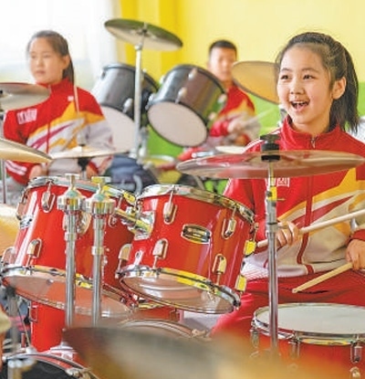 黑龍江省安達(dá)市任民鎮(zhèn)中心小學(xué),學(xué)生們在教室練習(xí)架子鼓。新華社記者 謝劍飛攝