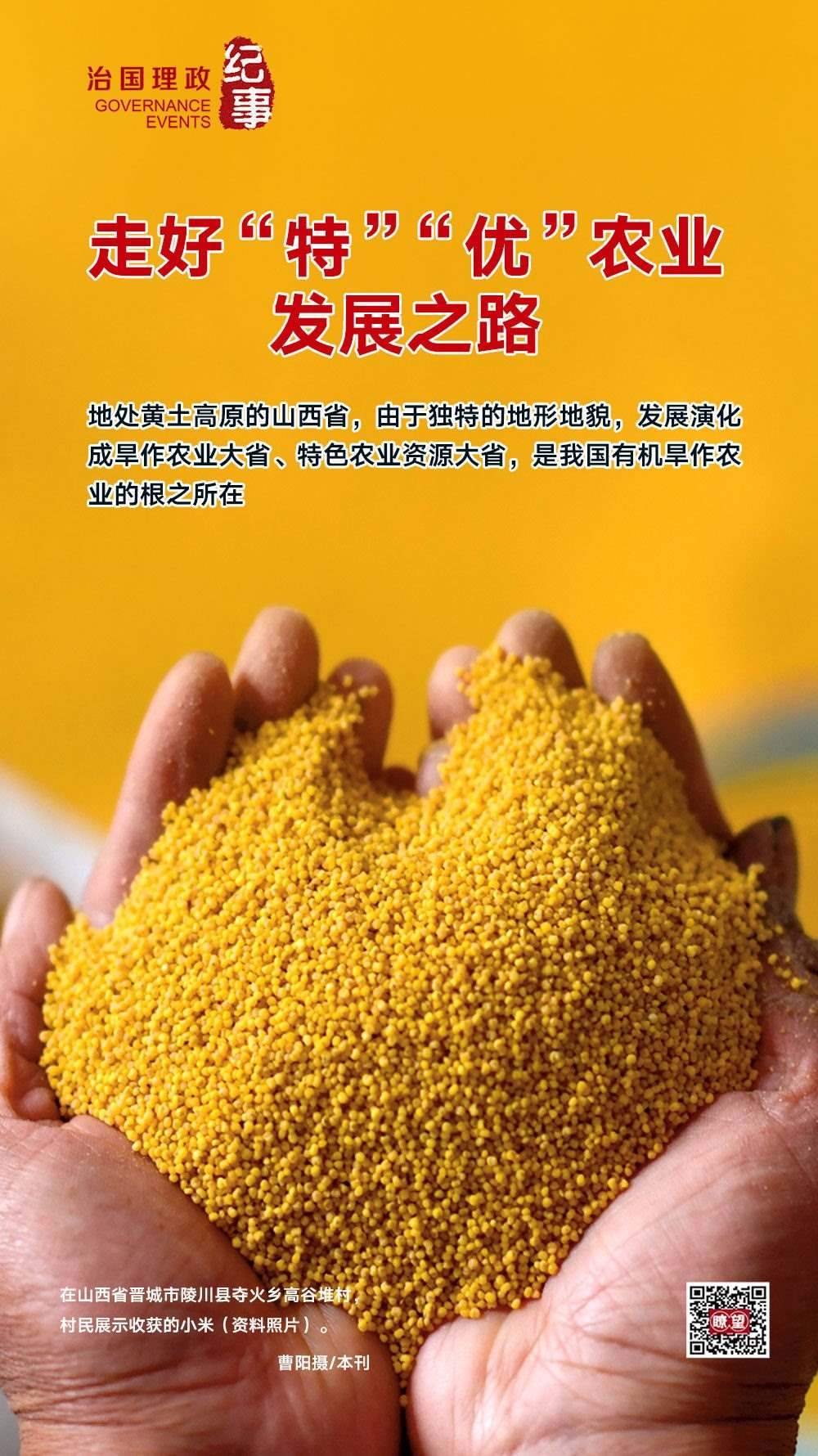 ◇2020年5月,習近平總書記在山西考察時強調,山西山多地多、地貌多元、氣候多樣,這種獨特的資源稟賦決定了山西農業(yè)的出路在于“特”和“優(yōu)”。要深入推進農業(yè)供給側結構性改革,提高農業(yè)綜合效益和競爭力。