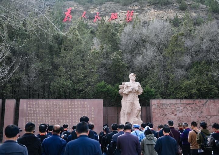參觀者在延安棗園《為人民服務(wù)》講話紀(jì)念廣場參觀。新華社記者 張博文 攝