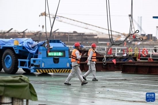 6月27日,岸邊集裝箱起重機(jī)和軌道吊運(yùn)抵秘魯錢(qián)凱港。 新華社發(fā)(上海振華重工供圖)