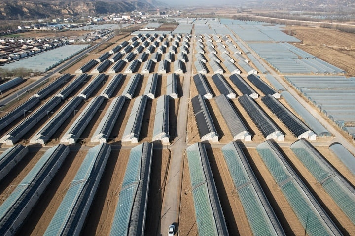 2023年11月26日,甘肅省平?jīng)鍪袥艽h涇汭河川區(qū)萬畝設(shè)施蔬菜產(chǎn)業(yè)園王村核心區(qū)(無人機(jī)照片)。這是當(dāng)?shù)匾劳刑旖蚴袞|西部協(xié)作幫扶資金實(shí)施的聯(lián)建項(xiàng)目。新華社記者 范培珅 攝